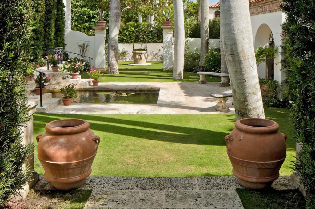 SMI Landscape Architecture designed the gardens for this historic house in Palm Beach in keeping with the style and age of the house. They created a series of formal and informal spaces that flow and connect while keeping a sense of mystery. In this garden, SMI used terracotta pots to define and separate the spaces and provide garden accents.